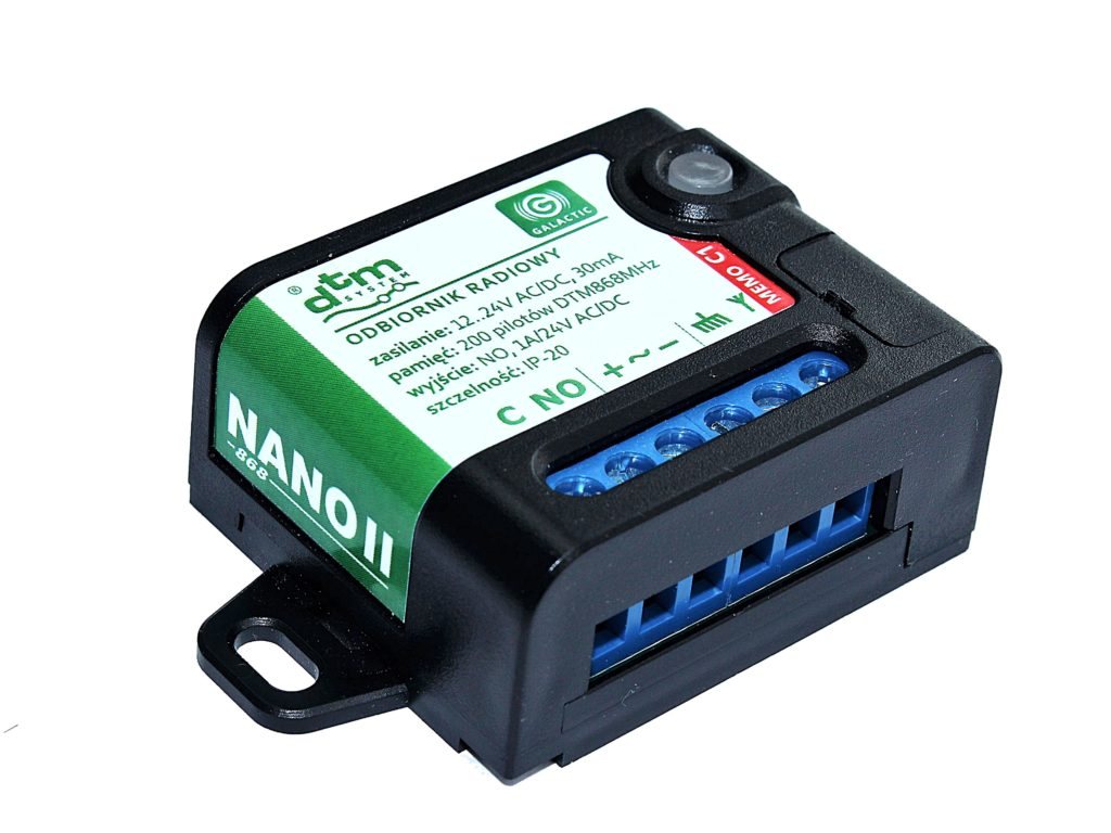 NANO2 868 to 1-kanałowy odbiornik w kompaktowej obudowie. Powstał z myślą o użytkownikach ceniących łatwość montażu. Cechuje się bardzo prostą obsługą przy zachowaniu dużej funkcjonalności. Wyposażony jest w złącze USB umożliwiające zarządzanie pilotami pracującymi w systemie DTM868MHz. Przeznaczony jest do współpracy ze sterownikami bram, rolet i innymi urządzeniami automatyki.